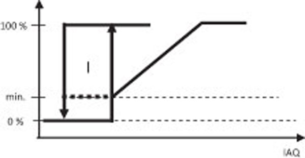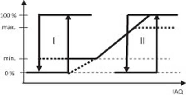 Pri tomto spôsobe riadenia sa používajú ventilátory s regulovateľnými otáčkami s frekvenčným meničom alebo zmenou napätia. Pri zhoršení kvality vzduchu regulátor zapne ventilátor, ktorý sa prevádzkuje na minimálne otáčky. Klapka čerstvého vzduchu sa otvorí do maximálnej polohy. Pri ďalšom zhoršovaní kvality vzduchu sa otáčky ventilátora plynulo zvyšujú (obr. 4).