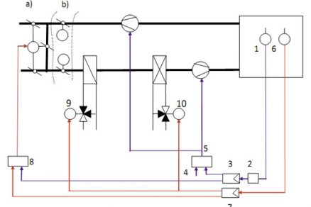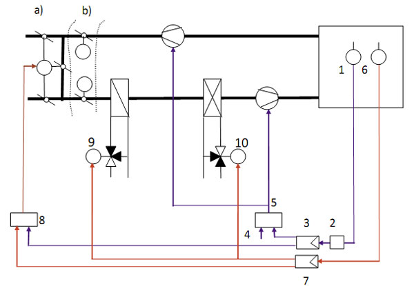 Na obr. 2 je schéma zapojenia vzduchotechnického zariadenia s čiastočnou úpravou vzduchu. Na potreby regulácie dodávky vzduchu podľa kvality sa použil kombinovaný snímač CO2/zmesi plynov. Signály o úrovni škodlivín spracováva počítač potreby vetrania ako výsledok výberu maximálnej hodnoty z oboch údajov. Regulátor kvality porovná výsledný signál so žiadanou hodnotou a ak vznikne odchýlka, pôsobí na ventilátory, prípadne elektrické pohony klapiek. Ventilátory zabezpečujúce prúdenie vzduchu v potrubí sa môžu navrhnúť s konštantným alebo premenlivým výkonom, ktorý možno riadiť stupňovito alebo plynulo [3]. Pri stupňovitom riadení sa používajú dvojotáčkové alebo trojotáčkové motory, pričom zmena otáčok sa realizuje skokovo prepínaním počtu pólov. Ďalšou možnosťou je riadenie na základe zmeny napätia, pri ktorom sa výkon mení, napríklad, v piatich stupňoch, pričom každému stupňu zodpovedá 20 % výkonu. Energeticky najvýhodnejšie riadenie výkonu je prostredníctvom frekvenčného meniča, ktorý reguluje výkon ventilátorov plynulo od 0 do 100 %.