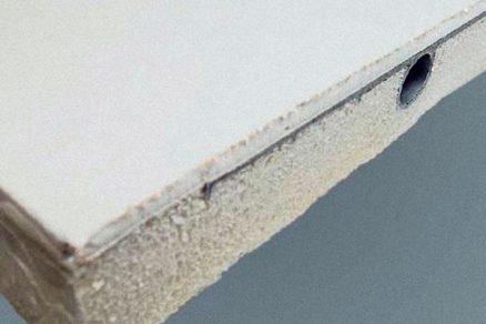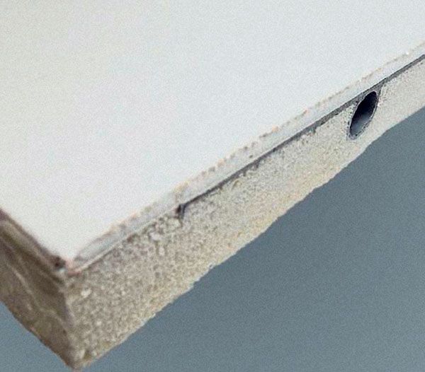 Sendvičové konštrukcie chladiacich panelov (obr. 3) sú kompaktným prvkom, ktorý obsahuje zvyčajne chladiaci element, pohľadovú dosku a izolačnú vrstvu. Pohľadovú dosku tvorí buď tenká vrstva sadrokartónu, alebo hliníkový plech s náterom. Chladiace elementy sú nalepené na doske s aplikovanou hliníkovou fóliou a sú zaliate do polyuretánovej peny, ktorá plní funkciu tepelnej a akustickej izolácie. Takto tvorený chladiaci panel zabraňuje kondenzácii vodných pár vo vnútri konštrukcie a minimalizuje tepelné straty. Panely sa potom montujú na bežnú hliníkovú konštrukciu pre sadrokartónové dosky. Sendvičovú konštrukciu môže tvoriť takisto panel so zaliatymi kapilárnymi rohožami. Na rozdiel od kontaktných systémov možno sendvičové konštrukcie využiť aj na stenové aplikácie.