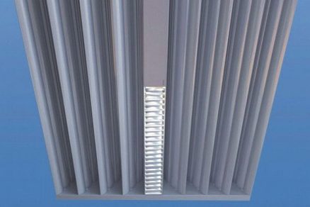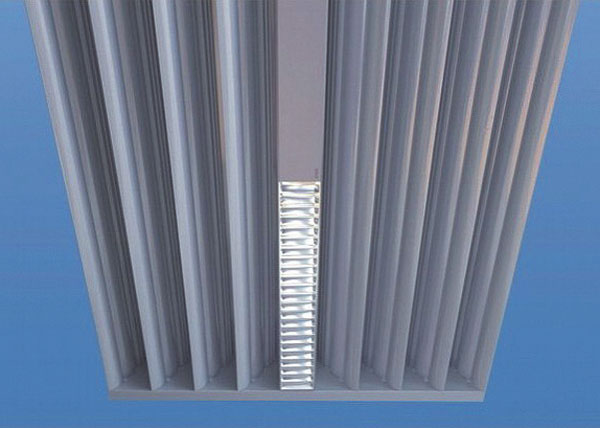 Chladiace stropy môžu tvoriť rôzne tvarované konštrukcie. Na obr. 6 je znázornený príklad integrácie osvetľovacích telies do otvorenej konštrukcie chladiaceho stropu.