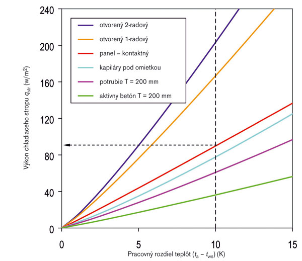 Otvorené chladiace stropy dosahujú výrazne vyššie chladiace výkony než uzatvorené typy. Vyplýva to jednak zo zvýšeného prestupu tepla konvekciou vplyvom intenzívnejšieho prúdenia okolo lamiel a tiež z väčšej teplovýmennej plochy. Jednoradové otvorené chladiace stropy dosahujú o 50 až 100 %, dvojradové potom dokonca až o 120 % vyššie chladiace výkony než uzatvorené stropy. Na obr. 4 je znázornené porovnanie merných výkonov rôznych konštrukcií chladiacich stropov v závislosti od rozdielu teploty vnútorného vzduchu a strednej teploty chladiacej vody (ta – tws).