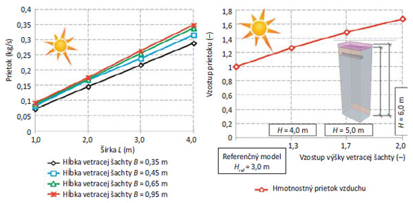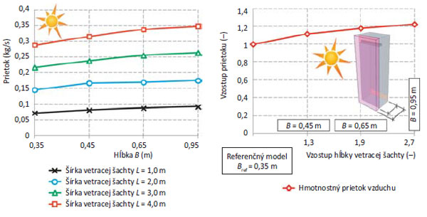 Prvou čiastkovou úlohou bolo posúdiť vplyv hĺbky vetracej šachty (B) na hmotnostný prietok vzduchu pri konštantnej výške solárneho komína (H = 3,0 m). Menili sa štyri varianty parametra B pri súčasnej zmene šírky šachty (L) tak, ako to znázorňuje graf na obr. 5a. So zväčšujúcou sa hĺbkou síce stúpa prietok vzduchu, ide však o nepatrný nárast, čo si možno všimnúť aj na grafe na obr. 5b. Pri 2,7-násobnom zväčšení hĺbky vetracej šachty sa dosiahne zhruba 1,2-násobné zvýšenie prietoku vzduchu solárnym komínom. To je veľmi zanedbateľná hodnota v porovnaní s takým výrazným zväčšením parametra hĺbky vetracej šachty, ktoré má súčasne vplyv aj na náročnosť konštrukčného vyhotovenia takého typu solárneho komína. Z výsledkov analýzy vyplynulo, že návrh hĺbky vetracej šachty solárneho komína by sa mal pohybovať v rozpätí 0,35 až 0,45 m pri šírke do 2,0 m. Pri vetracej šachte širokej viac ako 2,0 m možno ešte uvažovať o zväčšení hĺbky na 0,65 m.