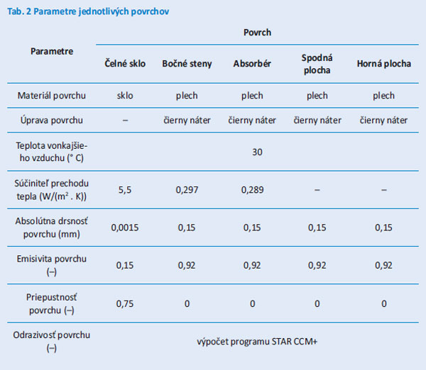 Pri výskume sa použil model solárneho komína v základnom vyhotovení vetracej šachty (obr. 4), s ľahkým plechovým absorbérom na zadnej stene, povrchovo upraveným čiernym matným náterom. Transparentnú časť tvorí iba predný diel solárneho komína z jednoduchého tvrdeného kaleného skla s hrúbkou 12 mm. Všetky ostatné časti solárneho komína sú nepriehľadné, izolované tepelnou izoláciou s hrúbkou 150 mm. V tab. 2 sú parametre, ktoré charakterizujú vlastnosti jednotlivých povrchov.