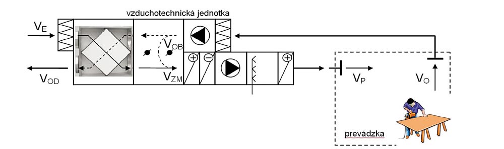 Obr. 2 Vzduchotechnický systém s centrálnou úpravou vzduchu s využitím SZT prostredníctvom regenerácie