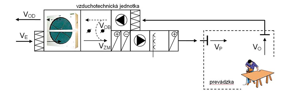 Obr. 1 Vzduchotechnický systém s centrálnou úpravou vzduchu s využitím SZT prostredníctvom rekuperácie a zmiešavacej komory