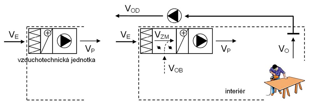 a) zmiešavacej komore – je to systém s najvyššou účinnosťou získavania tepla z odvádzaného vzduchu s tým, že do priestoru sa vracia istá časť obehového vzduchu. Pri väčšine prevádzok to nie je problém, ak je zabezpečená minimálna hygienická dávka vzduchu na osobu a v priestore nevznikajú látky škodlivé pre zdravie;