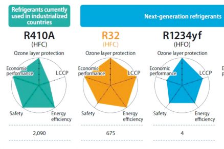 Na obr. 1 vidieť porovnanie dôležitých vlastností vybraných chladív, ako sú bezpečnosť (safety), ekonomická výkonnosť (economic performance), ODP (ozone depletion potential), celkový vplyv na oteplenie počas životného cyklu (LCCP) a energetická efektivita (energy efficiency). Platí pritom, že R22 sa používa v súčasnosti v rozvojových krajinách, R410A v priemyselne vyspelých krajinách a chladivá R32, R1234yf a R290 patria k novej generácii chladív, označovanej spoločným názvom alternatívne chladivá.