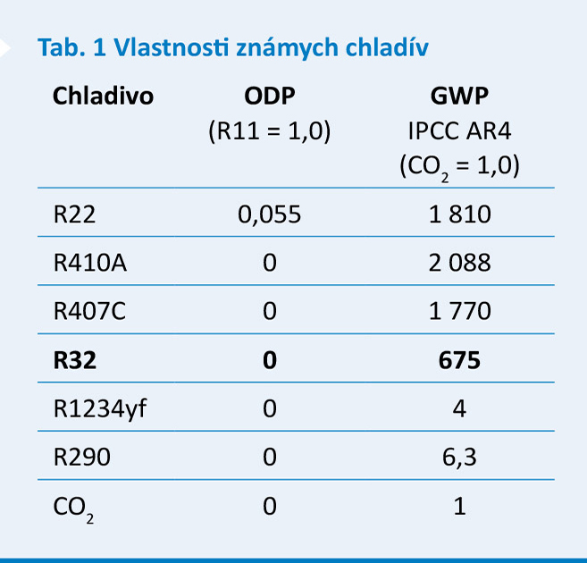 Prečo je práve o toto chladivo taký záujem? V tab. 1 je uvedený prehľad praktických vlastností známych chladív v porovnaní s chladivom R32, pričom ODP (Ozone Depletion Potential) je uvedený už iba pri chladive, pri ktorom je ďalšia distribúcia už vylúčená (R22). Chladivá R32, R1234yf a 290 patria pritom do skupiny alternatívnych perspektívnych chladív.