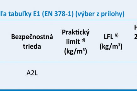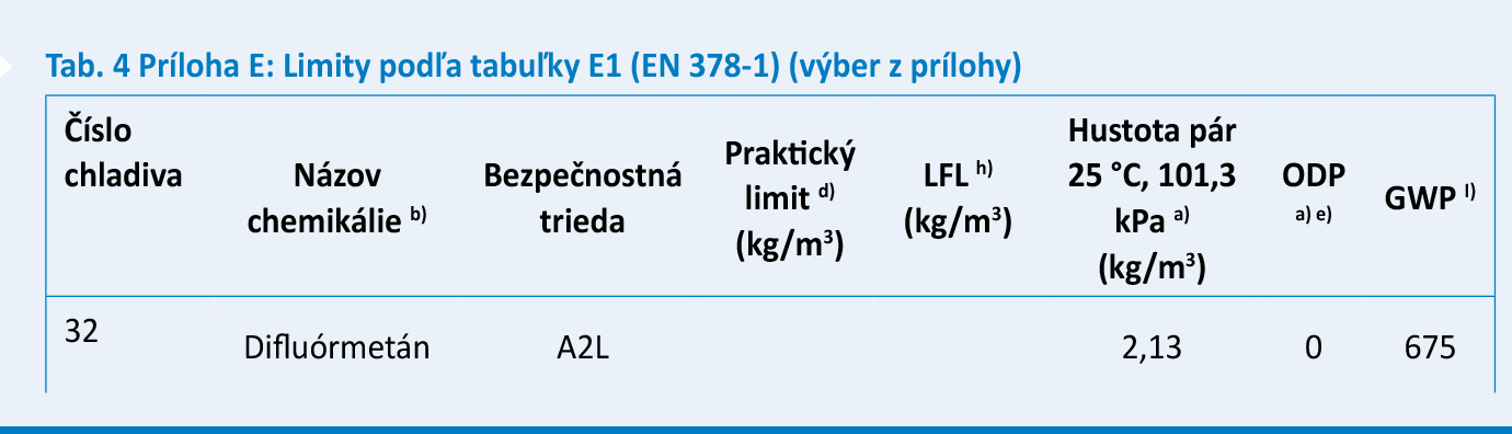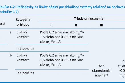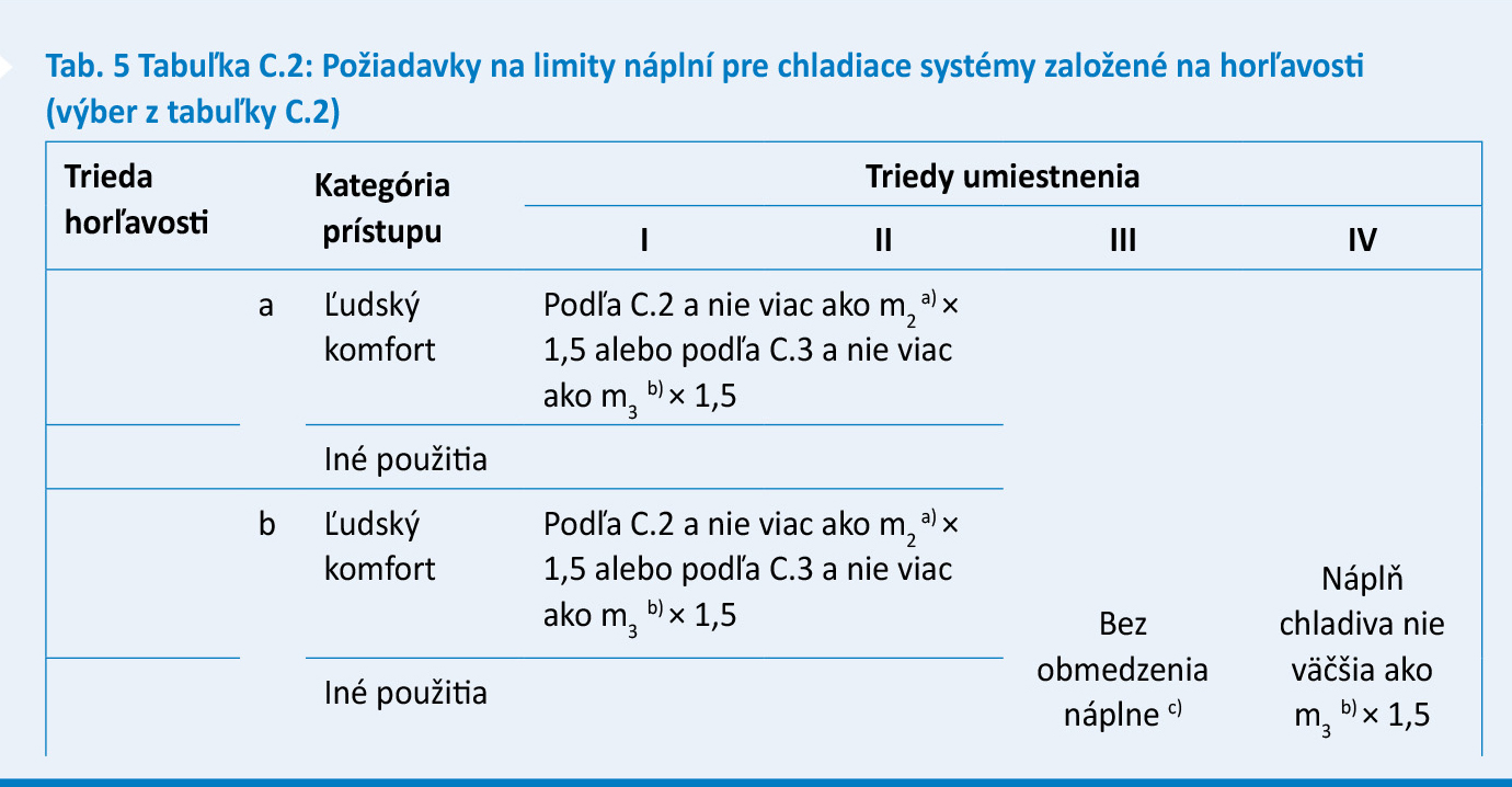 - určí sa limit náplne pre chladiaci systém založený na horľavosti ako väčší: – z limitu náplne v tabuľke C.2 (tab. 5), – alebo vzťahu m1 (základný stropný faktor) × 1,5 (pri hermetických chladiacich systémoch s použitím triedy horľavosti 2L),
