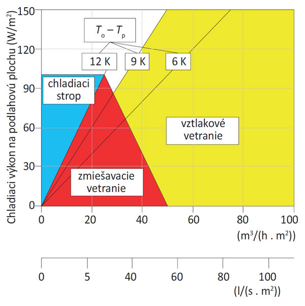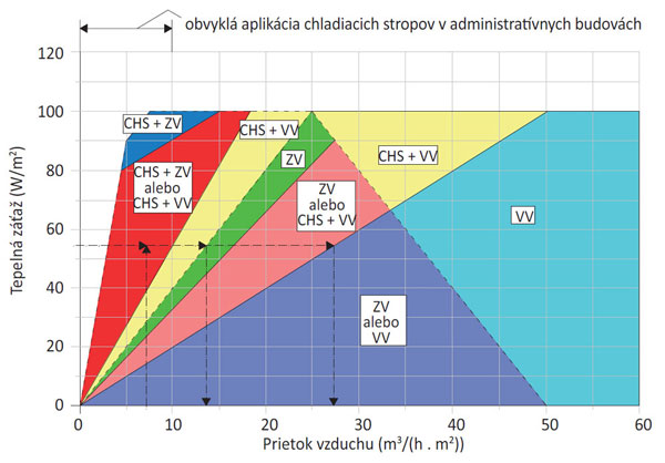 Približný návod na určenie možných kombinácií chladiaceho stropu so vztlakovým alebo zmiešavacím vetraním je na obr. 8. Kritériom pri zostavovaní grafu bola schopnosť systému zabezpečiť komfortné tepelné prostredie a zároveň čo najlepšiu kvalitu vzduchu. Pri vysokej tepelnej záťaži možno kombinovať chladiace stropy so vztlakovým, prípadne so zmiešavacím vetraním. Pri nižšej tepelnej záťaži a vysokých prietokoch vzduchu postačí zmiešavacie alebo vztlakové vetranie bez doplnkového chladiaceho systému.