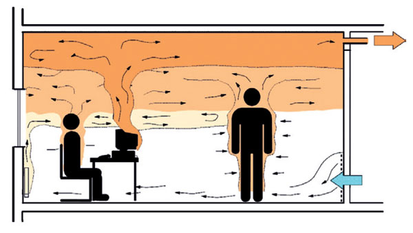 Pri vztlakovom vetraní sa vzduch privádza na úrovni podlahy pri teplote nižšej, než je teplota vzduchu v miestnosti. Čerstvý vzduch sa šíri po podlahe, v blízkosti vnútorných zdrojov tepla (napríklad ľudia, počítače či osvetlenie) sa zohrieva na teplotu vyššiu, než je teplota okolitého vzduchu v miestnosti, tým sa znižuje jeho hustota a v dôsledku vztlakovej sily vzniká vertikálny pohyb smerom zdola nahor. Ak sú zdroje tepla zároveň zdrojmi znečistenia, t. j. kontaminant má vyššiu teplotu ako okolitý vzduch, vztlaková sila ho efektívne odvedie do hornej časti miestnosti – nad pobytovú zónu (hranica pobytovej zóny človeka sa zvyčaje uvažuje vo výške 1,8 m nad podlahou). Vytvorí sa tak hranica medzi spodnou časťou miestnosti s čistým vzduchom a hornou časťou miestnosti so znečisteným vzduchom, kde sa vzduch z miestnosti odvádza. V závislosti od sily a geometrie zdrojov tepla stúpajú konvekčné prúdy nahor až k stropu (silné zdroje tepla) alebo sa ustália na nižšej hladine (obr. 2). Problém nastáva, ak kontaminant pochádza zo slabého zdroja tepla a stúpajúci prúd teplého vzduchu nad zdrojom tepla je príliš slabý na to, aby dosiahol hornú časť miestnosti nad pobytovou zónou. V takomto prípade nie je kontaminant účinne odvedený mimo pobytovú zónu, ale skôr naopak, zmieša sa so vzduchom v stúpajúcom konvekčnom prúde v blízkosti človeka a je transportovaný do jeho inhalačnej zóny, čím sa účinnosť vetrania znižuje.