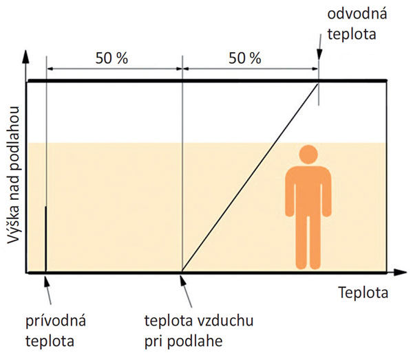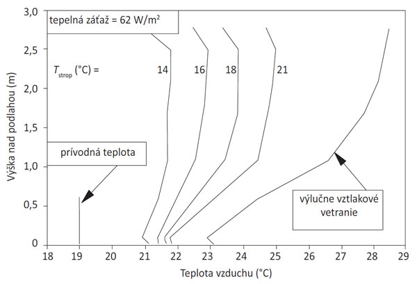 Ak je tepelná záťaž príliš vysoká alebo ak treba pokryť tepelnú stratu v zimnom období, možno vztlakové vetranie kombinovať s podlahovým sálavým systémom. Praktické skúsenosti a experimentálne merania ukázali, že v zime sa dá vztlakové vetranie dobre kombinovať s podlahovým vykurovaním. Príklad vertikálneho teplotného profilu získaného z experimentálnych meraní v simulovanej kancelárii so vztlakovým vetraním a podlahovým vykurovaním je na obr. 5. Teplotný profil bol nameraný pri výmene vzduchu 3,1-krát za hodinu, teplote privádzaného vzduchu 14 °C a pri vnútorných tepelných ziskoch 31 W/m2 podlahovej plochy. Pri podlahovom vykurovaní pôsobí teplá podlaha na okolité chladné povrchy sálaním. Okrem toho prebieha prenos tepla odovzdávaním z podlahy do chladného vzduchu, ktorý sa šíri na úrovni podlahy. Pri návrhu systému treba venovať pozornosť teplote podlahy, priveľmi teplá podlaha by totiž mohla zohriať privádzaný chladný vzduch prirýchlo a vzduch by mohol stúpať nahor pred dosiahnutím inhalačnej zóny užívateľov, v dôsledku čoho by sa znížila účinnosť vetrania. Prax ukázala, že teplota podlahy pod približne 25 °C a teplota privádzaného vzduchu približne 2 °C pod teplotou vzduchu v miestnosti by mali zabezpečiť bezproblémové prúdenie privádzaného vzduchu na úrovni podlahy [2]. Pri kombinácii vztlakového vetrania so sálavým systémom už viac neplatí pravidlo 50 %, pretože zákonitosti distribúcie teploty sa zmenia. Napríklad so zvyšujúcou sa teplotou podlahy sa zvyšuje aj teplota vzduchu na úrovni podlahy, a tak napríklad pri výkone podlahy 60 W/m2 môže platiť pravidlo 80 %, čo znamená, že teplota vzduchu na úrovni podlahy je v 80 % medzi teplotou privádzaného vzduchu a teplotou odvádzaného vzduchu [6].