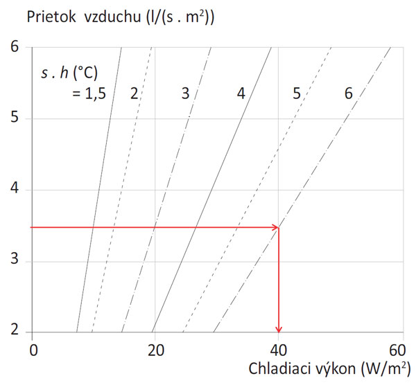 Mundt [5] na základe mnohých meraní odvodila model, ktorý umožňuje odhadnúť chladiaci výkon vztlakového vetrania ako funkcie minimálneho prietoku vzduchu pri rôznych hodnotách súčinu teplotného gradientu a výšky miestnosti. Ak je napríklad výška miestnosti 3 m, teplotný gradient 2 °C/m a prietok vzduchu 3,5 l/(s . m2), chladiaci výkon vztlakového vetrania je približne 40 W/m2 (obr. 4).