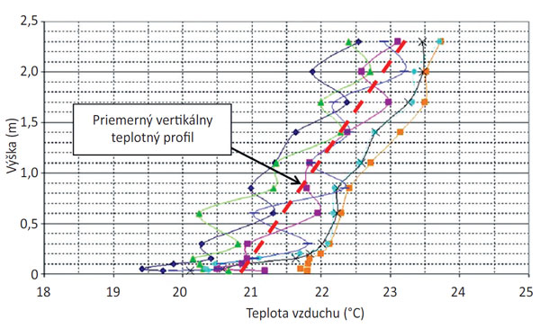 Obr. 5 Príklad vertikálneho profilu teploty vzduchu z experimentálnych meraní v simulovanej kancelárii so vztlakovým vetraním a podlahovým vykurovaním [6]
