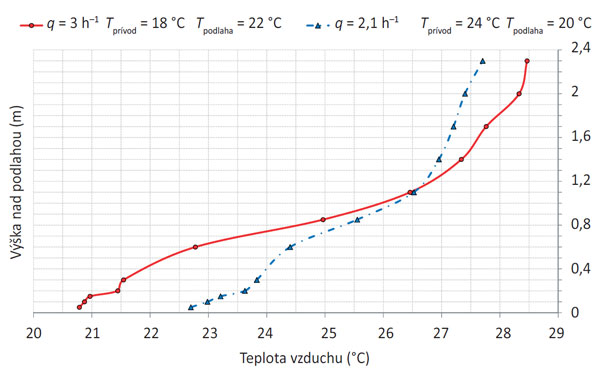 Nevýhodou podlahového chladenia môže byť to, že v kombinácii so vztlakovým vetraním sa ešte zvyšuje vertikálny rozdiel teplôt vzduchu medzi hlavou a členkami, čo môže viesť k zvýšenej miere tepelnej nepohody. Príklad vertikálneho teplotného profilu získaného z experimentálnych meraní v simulovanej kancelárii so vztlakovým vetraním a podlahovým chladením je na obr. 6. Teplotný profil bol nameraný pri výmene vzduchu 2,1-krát za hodinu, teplote privádzaného vzduchu 18 °C, resp. 24 °C a pri celkovej tepelnej záťaži odhadnutej na 40 W/m2 podlahovej plochy.
