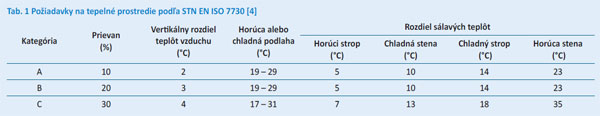 Dôležitou podmienkou správneho fungovania vztlakového vetrania je teplotný gradient. V priestore so vztlakovým vetraním sa teda vždy vyskytuje pozitívny vertikálny rozdiel teplôt vzduchu, čo však môže mať za následok tepelnú nepohodu, ak je vertikálny rozdiel teplôt vzduchu medzi členkami a hlavou privysoký. Nepohoda v dôsledku vertikálneho rozdielu teplôt vzduchu sa pripisuje pocitu horúcej hlavy alebo chladných chodidiel, alebo obom nežiaducim pocitom súčasne. Aby sme sa vyhli tepelnej nepohode, odporúča sa udržiavať vertikálny rozdiel teplôt medzi členkami (0,1 m nad podlahou) a hlavou (1,1 m nad podlahou pre sediacu osobu) do 3 °C. Limity na obmedzenie výskytu tepelnej nepohody odporúčané podľa [4] sú v tab. 1. Kategória A reprezentuje najvyššie požiadavky na kvalitu vnútorného prostredia, zatiaľ čo kategória C predstavuje najnižšie, no ešte stále prípustné limity na zaručenie tepelnej pohody.