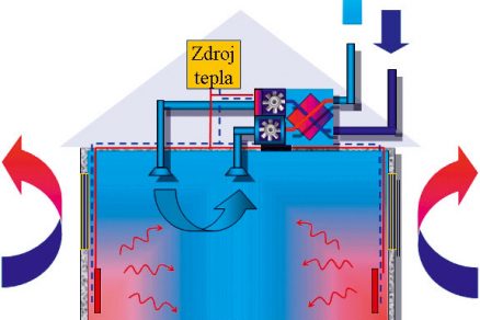 | Obr. 5: Teplovzdušné vykurovanie a vetranie s rekuperáciou a zemným výmenníkom | Obr. 6: Teplovzdušné vykurovanie a vetranie s rekuperáciou tepla |