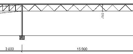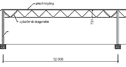 Najväčšia systémová výška väzníkov nad strednou podperou je iba 2,018 m. Priľahlých desať priehrad vymedzujú zvislice z hranolov 80 x 80 mm. Prvé štyri diagonály pri strede haly sú z hranolov 80 x 120 mm. V zostávajúcich šiestich priehradách je ich prierez zmenšený na 80 x 100 mm. Koncová atypická časť väzníkov je uložená na obvodovom múre s excentricitou 421 mm. Spojité pásové prúty sú z dvoch hranolov 60 x 180 mm. Na prípoje v uzloch sa použilo osem klincov 6 x 150 mm (obr. 2). Krytina haly v sklone 18,4 % z trapézového plechu s výškou 20 mm sa podložila parotesnou vrstvou a uložila na drevené väznice. Tieto drevené hranoly 80 x 180 mm sú situované prevažne v uzloch horného pása väzníkov.
