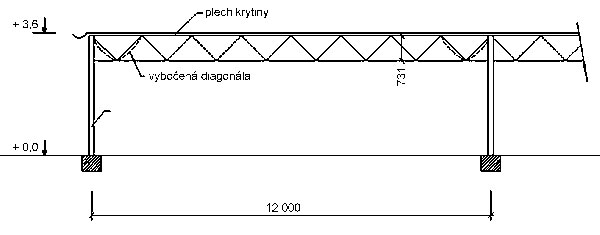 Havária skladovacej priemyselnej budovy ilustruje, že nosná konštrukcia môže byť v prevádzke dlhší čas napriek chybám v návrhu a nedokonalostiam pri jej realizácii. Oceľová konštrukcia halového objektu s troma loďami má stĺpové priečne väzby v pozdĺžnej osovej vzdialenosti do 3,0 m. Hlavné nosné stĺpy vysoké 3,6 m z valcových profilov HE 300 sú pomocou kotevných skrutiek votknuté do železobetónových základových pätiek (obr. 1). Priehradové priečniky, ako hlavné strešné priehradové nosníky, kĺbovo pripojené k vrcholu stĺpov, nesú ľahký strešný plášť. Jeho nosnú vrstvu tvoria široké ohýbané, za studena tvarované tenkostenné plechy. V spodných vlnách sú samoreznými skrutkami pripojené k horným pásovým prútom väzníkov. Pri kvalitnej realizácii tak mali väzníky zaistiť proti strate stability postranným klopením. Ľahká skladovacia hala bola navrhnutá na rozhodujúce klimatické zaťaženia snehom s intenzitou 0,7 kN/m2 (II. snehová oblasť).