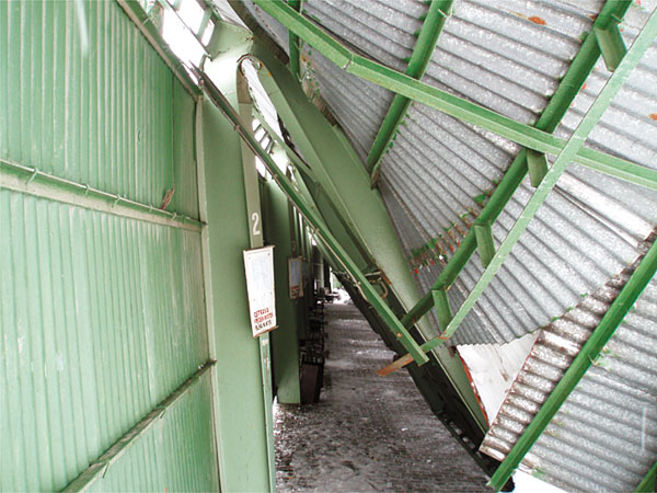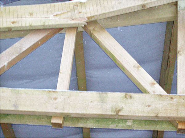 Iba výnimočne dochádza k poškodeniu konštrukcie jej nevedomým preťažením zapríčineným mimoriadnymi vplyvmi. Príkladom je krajčírska dielňa s pôdorysom 15 x 33 m. Halový objekt má 12 stĺpových priečnych väzieb vo vzájomnej vzdialenosti 3,0 m. Priehradový priečnik s rozpätím 15 m, kĺbovo uložený na plnostenných stĺpoch má na vonkajšej strane za fasádou konzolu dlhú 3,0 m. Takto vyložená časť strechy nad verejným chodníkom sa porušila pri zaťažení snehom (obr. 5). Nosná časť ľahkého strešného plášťa bola z tenkostenného trapézového plechu. Tepelnoizolačnú vrstvu vytvorili z dosiek na báze minerálnej vlny v kombinácii s penovým polystyrénom. Vrstvy povlakovej krytiny z asfaltových hydroizolačných pásov fixované asfaltovým náterom chránili strešný plášť proti poveternostným vplyvom. Poškodenú strechu po 10 rokoch prevádzky opravili pridaním doplnkovej vrstvy z penobetónu hrubej 30 mm spolu s ďalšími pomocnými hydroizolačnými asfaltovými pásmi. Prepočet ukázal, že práve toto stále prídavné zaťaženie spôsobilo zrútenie konzolových častí strechy po intenzívnom snežení.