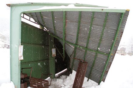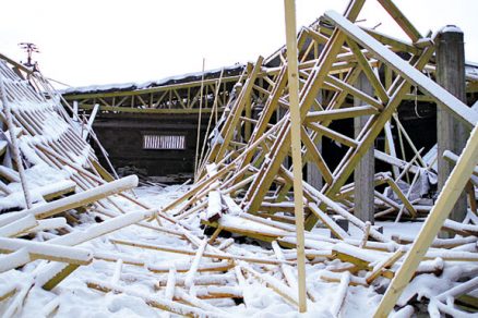 Začiatkom januára minulého roka sa v podvečer zrútila konzolová časť strechy nesúca vrstvu snehu 0,6 m. Havária sa začala v druhej priečnej väzbe s najväčšou prislúchajúcou zaťažovacou šírkou. V najviac namáhanom priereze konzoly pri stĺpe sa vytvoril plastický kĺb. Znehodnotením pozdĺžnych stužovadiel štvornásobne vzrástla dĺžka konzoly pri klopení, čo spôsobilo k stratu stability postranným vybočením.
