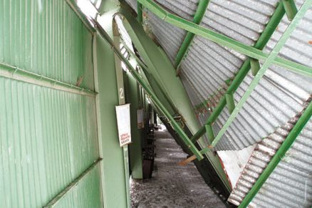 Po intenzívnom snežení a otepľovaní strechu v krajnej lodi priľahlej k administratívnej budove zaťažoval závej hrubý približne 0,4 m. K zlyhaniu väzníka v tejto oblasti došlo vybočením prvých dvoch výplňových prútov a následným postranným vybočením väzníka. Spoje plechovej krytiny strate stability nezabránili, lebo došlo k odstrihnutiu skrutiek Prepočet strechy ukázal, že limitujúcim prvkom bola prvá vzostupná diagonála väzníka namáhaná vzperným tlakom. Aj pri zanedbaní prídavného namáhania z excentrického pripojenia výplňových prútov z kruhovej betonárskej ocele nemala dostačujúcu vzpernú pevnosť ani pri predpísanom návrhovom zaťažení strechy. Preťaženie strechy tak odkrylo uvedené nedostatky návrhu.