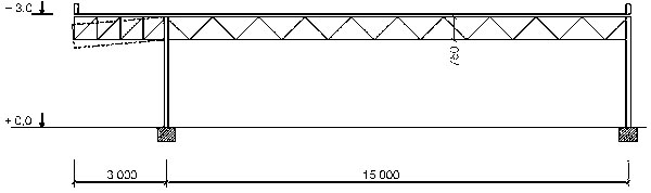 Havária strešnej konštrukcie autobusového nástupišťa svedčí o dôležitosti prevádzkovej údržby. Pôdorys 40 x 4,1 m prekrýval nosný systém z 11 konzolových priečnych väzieb votknutých do základov vo vzájomnej vzdialenosti 3,3 m až 4,6 m (obr. 4). Pozostávajú zo zvislej stojky vysokej 3,3 m. Prierez tohto stĺpa s výškou 430 mm oblúkom prechádza do konzoly s celkovou dĺžkou 4,1 m. Výška jej prierezu na styku so stĺpom je 300 mm, pričom ku koncu vyloženia sa zmenšuje na 170 mm. Kolmo na priečne väzby sú uložené uholníkové väznice. Na konci vyloženia konzoly a v jej strede majú priečne väzby pozdĺžne stužovadlá. Spolu s krytinou, stenovým plechom a priečnymi trámami spoľahlivo zabezpečovali priestorovú stabilitu nosného systému.
