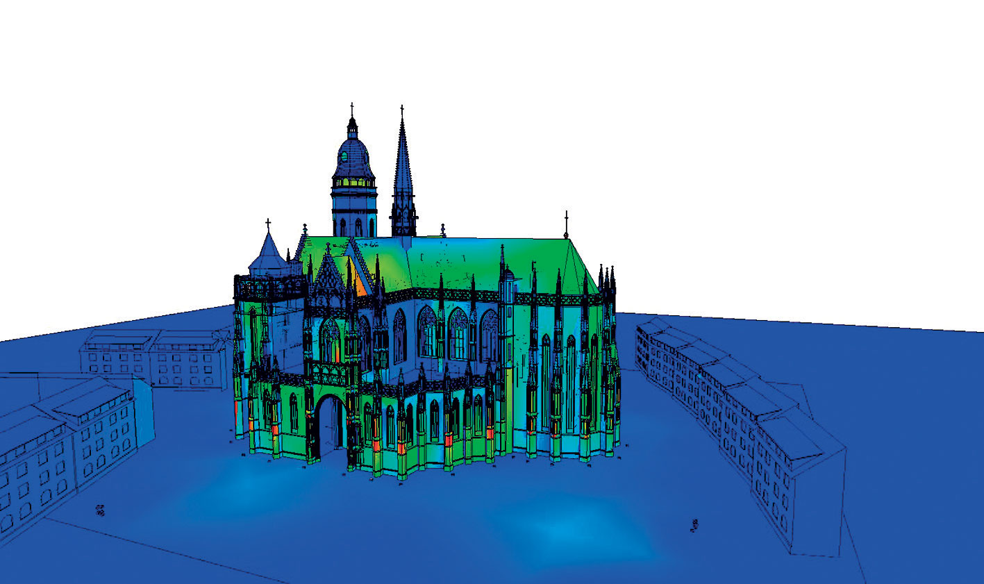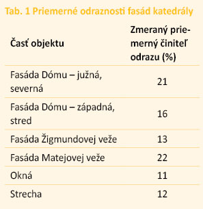 Každé meranie sa niekoľkokrát opakovalo s istým vzdialenostným rozptylom v rozsahu 20 až 50 cm – účelom bolo lepšie zohľadnenie meniacej sa farby pieskovca. Pri návrhu osvetlenia sa následne uvažovala spriemerovaná hodnota činiteľa odrazu. Priemerné odraznosti fasád katedrály sú uvedené v tab. 1.