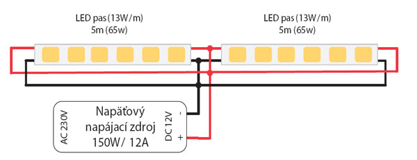 Obr. 1 Zapojenie napájania LED pásu z viacerých miest jedným zdrojom (zdroj: www.beloon.sk)