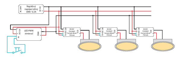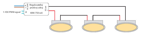 - pomocou regulovateľných napájacích prúdových zdrojov; zapojenie s regulovanými prúdovými zdrojmi umožňuje stmievať LED spoty viacerými spôsobmi: