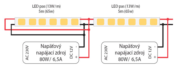 Obr. 2 Zapojenie napájania LED pásu z viacerých miest viacerými zdrojmi (zdroj: www.beloon.sk)