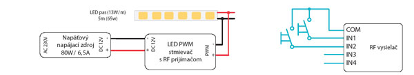 Obr. 6 Zapojenie PWM LED stmievača s rádiovým prijímačom a rádiového vysielača ovládaného tlačidlom (zdroj: www.beloon.sk)