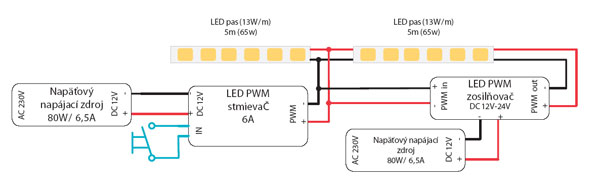 Pri väčšine lacných stmievačov je to do 4 A, čo predstavuje pri 12 V DC 480 W. Ideálna hodnota je minimálne 10 A, čo postačí na 10 m LED pásu. Na trhu sú aj výkonnejšie LED PWM stmievače s rozsahom od 16 do 20 A. Ďalšie zosilnenie možno dosiahnuť pomocou PWM zosilňovača, ktorý sa zapája medzi PWM LED stmievač a LED pás (obr. 7).