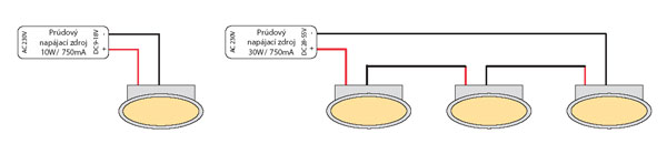 V praxi sa používajú zapojenia, pri ktorých sa každý LED spot napája samostatným malým zdrojom konštantného prúdu (obr. 9, vľavo), alebo zapojenia, kde je niekoľko LED spotov zapojených do série napojenej na zdroj konštantného prúdu. Ten však musí mať rozsah výstupného napätia rovný minimálne súčtu všetkých nominálnych výkonov LED spotov v sérii (obr. 9, vpravo).
