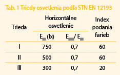 Pri návrhu tried osvetlenia sa vychádzalo z odporúčaní normy STN EN 12193, ktorou sa stanovujú triedy osvetlenia podľa tab. 1. Počítalo sa s referenčnou plochou pre ľadový hokej v rozmeroch 60 m × 30 m.