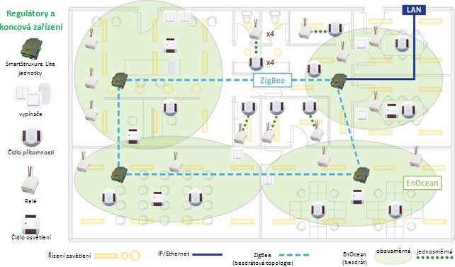 - Zelené zóny sú riadené pomocou SmartStruxure Lite regulátorov, ktoré môžu odosielať a prijímať informácie do i z okolitých EnOcean koncových zariadení.