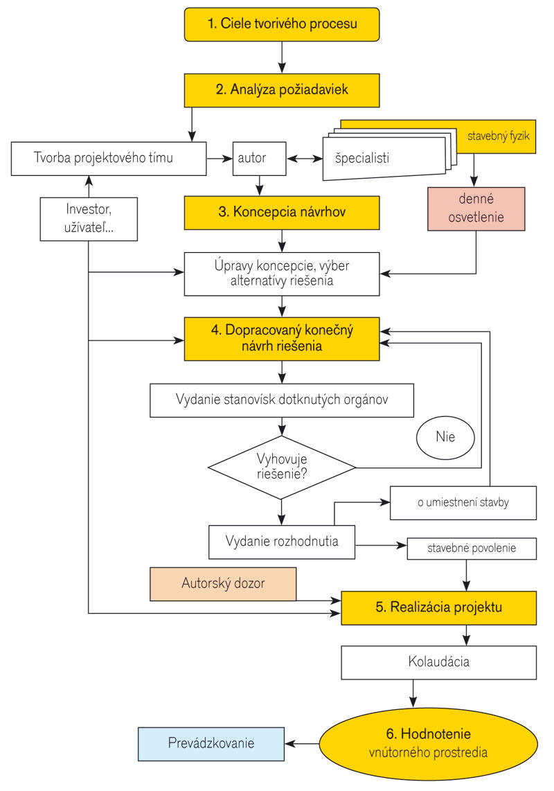 Životný cyklus budovy od jej návrhu cez realizáciu až po prevádzkovanie sa nezaobíde bez riešenia požiadaviek na denné svetlo. Väzbu tvorby architektonického diela a stavebnej fyziky (časť denné osvetlenie) v etape projektovania možno uplatniť postupom uvedeným na obr. 1. Je to vlastne metodika, algoritmus optimálnej postupnosti pri návrhu denného svetla v budovách. V ďalších fázach životného cyklu budovy dochádza k zmenám oproti projektu, čo sa premieta do svetlotechnickej kvality prostredia (5).