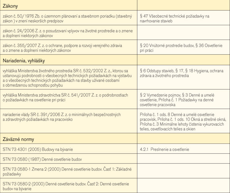 Hierarchické usporiadanie legislatívnych nástrojov s požiadavkami na denné svetlo v budovách je uvedené v tabuľke.