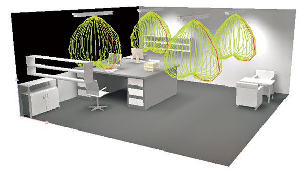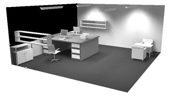 | Obr. 2 Priestorové 3D rozloženie svetelného toku svietidiel | Obr. 3 Vizualizácia kancelárie v programe Dialux |