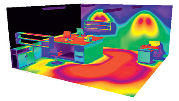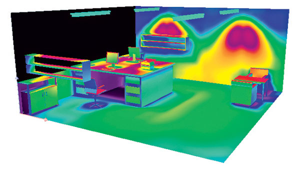 V štúdii sa použili celkovo tri druhy výkonných výpočtových a simulačných programov Dialux 4.9, Ecotect Analysis 2011 a Daysim. Program Dialux je svetelnotechnický program, ktorý sa využíva najmä na výpočty a vizualizácie vonkajšieho a vnútorného umelého osvetlenia. Ovládanie programu je pomerne jednoduché a intuitívne. Do programu sa dajú importovať pomocou prídavných modulov (plug-in) alebo online katalógov skutočné údaje o svietidlách s reálnymi parametrami svietivosti. Na prezentáciu výsledkov možno pripraviť realistické vizualizácie alebo aj videosekvencie (obr. 4, 5). V programe Dialux 4.9 sa vymodelovala kancelária s navrhnutými rozmermi a vlastnosťami povrchov spolu s určením vyhovujúceho umelého osvetlenia.