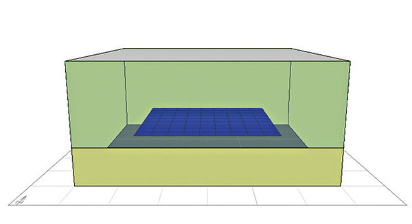 V rámci hodnotenia sa porovnávali kancelárie štvorcového pôdorysu s rozmermi 6 × 6 m a s výškou 2,8 m. V kanceláriách bolo pásové okno dlhé 6 m na celú šírku miestnosti, s výškou 1,9 m a parapetom vo výške 0,9 m (obr. 3). Okná boli bez žalúzií a so žalúziami s manuálnym a stmievaným režimom ovládania umelého osvetlenia. Vo výpočtoch sa použili hodnoty činiteľov odrazu vnútorných a vonkajších povrchov podľa tab. 1. Tienenie od okolitých stavieb sa nebralo do úvahy z dôvodu zjednodušenia prezentácie metodiky DA.