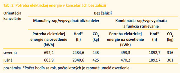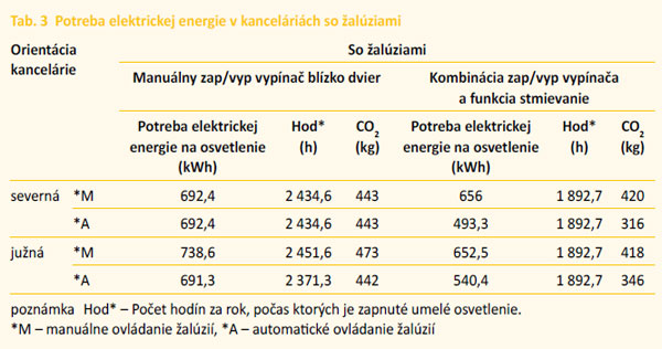 Na vyčíslenie potreby energie a znižovania emisií CO2 možno uviesť príklad, keď sa použijú žalúzie s automatickým ovládaním a ovládaním pomocou vypínača so senzorom pohybu. Potom možno očakávať úsporu spotreby energie o približne 151 kWh, zníženie emisií CO2 o 96 kg a zníženie času, počas ktorého je umelé osvetlenie v prevádzke, o približne 478 hodín. Ak vezmeme do úvahy, že ide iba o jednu kanceláriu, a nie celú budovu, je evidentné, že správnym návrhom osvetľovacích otvorov a dispozičného riešenia budovy možno pri jej prevádzke ušetriť značné množstvo energie.