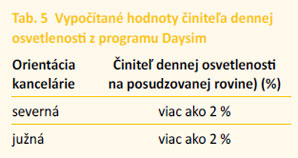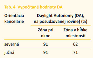 Ako sme už uviedli, koncept činiteľa dennej osvetlenosti má pri návrhu, hodnotení a využívaní denného osvetlenia vo vnútorných priestoroch budov svoje obmedzenia, pretože je založený na jednom type oblohy. Pre obe kancelárie na posudzovanej rovine sa zistili hodnoty činiteľa dennej osvetlenosti vyššie ako 2 % (tab. 5). Metóda DA bola vyvinutá tak, aby poskytovala komplexnú analýzu denného svetla v budove. V tab. 4 vidieť výsledné hodnoty tohto parametra na celej posudzovanej rovine. Rozdiely sú badateľné vo väčšej vzdialenosti od okna. Hodnota DA závisí od lokality, minimálnej hodnoty osvetlenia, orientácie interiéru na svetové strany, typu užívateľa, obsadenosti miestnosti a od typu tienenia okien. Výsledky v tab. 2 a tab. 3 ukazujú, že potreba elektrickej energie bude približne rovnaká, aj keď badať tendenciu lepšej bilancie pri južnej kancelárii, čo vyplýva z okrajových podmienok použitých v simulačných výpočtoch. Na severnej strane v netienenej miestnosti zabezpečuje difúzne oblohové svetlo vyhovujúce podmienky na osvetľovanie denným svetlom. Vysoká úroveň priameho slnečného svetla na južnej strane sa reguluje tieniacou technikou na požadovanú úroveň, čím nevznikajú dodatočné nároky na používanie umelého osvetlenia.