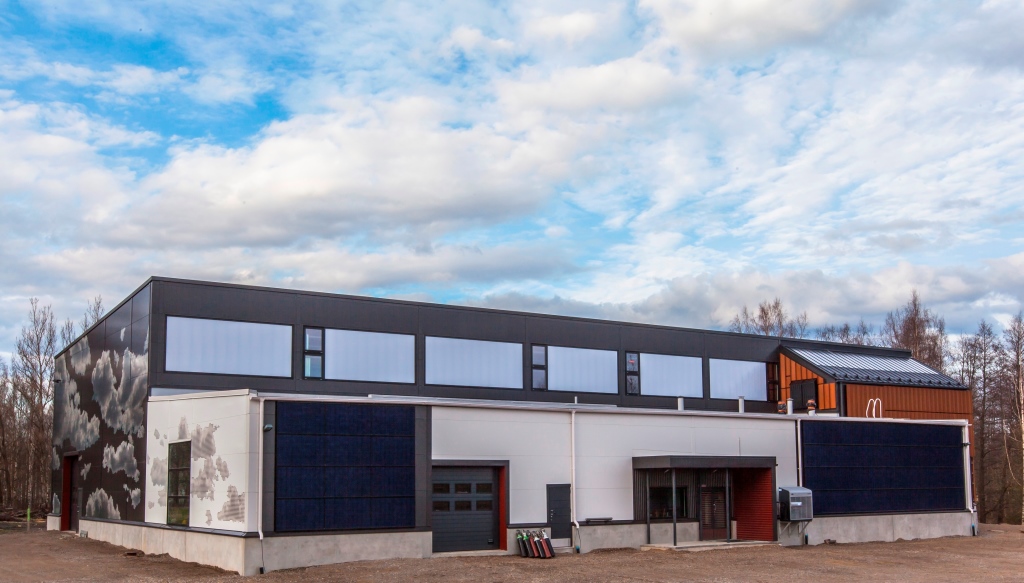 Fasáda budovy je postavená z energeticky úsporných – vzduchotesných panelov Ruukki v piatich rôznych farbách. Okrem fasády On-Wall Solar, ktorá generuje solárnu elektrickú energiu, sa pôsobivý vzhľad fasády dosiahol aj pomocou novinky Ruukki Expression a Ruukki Forma. V západnom štíte budovy boli nainštalované panely Ruukki Expression na ploche približne 240 m2. Tento produkt umožňuje stvárniť na panelovej fasáde akýkoľvek typ grafického obrazu alebo vzoru. Na tejto energeticky úspornej budove ilustruje obloha pokrytá mrakmi pozitívny prístup k životnému prostrediu. Na časti pre opláštenie technických priestorov bola namontovaná fasáda Ruukki Forma s designom lamely Cor-Ten pokrývajúca plochu približne 90 m2. Konštrukčný systém Ruukki Forma umožňuje montáž fasádnych produktov Ruukki v kombinácii s panelmi, a tak dosiahnuť jedinečný vzhľad budovy.