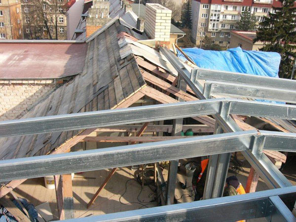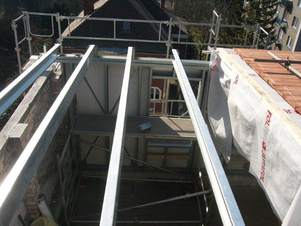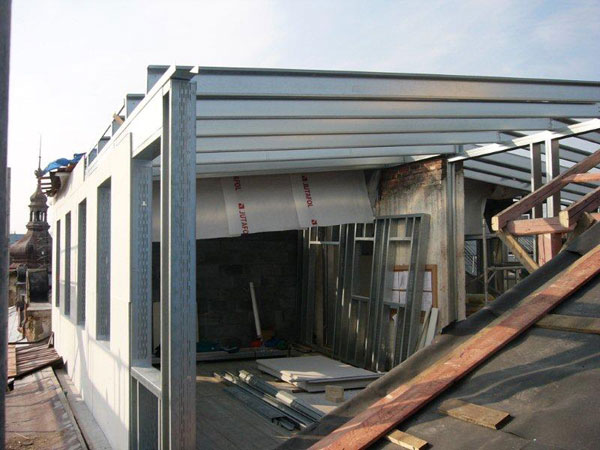 Tenkostenná oceľová konštrukcia rástla postupne. Montážnici pripravili jednotlivé stenové rámy na zemi. V čase odstránenia príslušnej časti existujúceho krovu sa tieto ihneď vyzdvihli na strechu a umiestnili na veniec obvodového muriva. Rámy sa následne doplnili konštrukciou strechy, debnením a fóliou. Tento krok sa opakoval vždy po takých celkoch, aby sa bola konštrukcia vždy zabezpečená proti dažďu. Postupne sa dopĺňalo opláštenie sadrovláknitými doskami s následnou montážou roštu a debnenia odvetranej fasády. Nakoniec sa realizovali klampiarske práce, uloženie krytiny na steny a strechu a montáž bezpečnostných prvkov (snehové zábrany a lávky na prístup ku komínu). Formát drážkovej krytiny sa musel na stenách prispôsobiť šírke okien tak, aby sa zabezpečila maximálna architektonická čistota pohľadových strán fasády.
