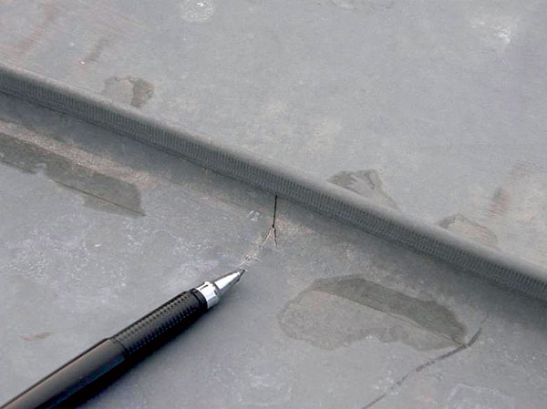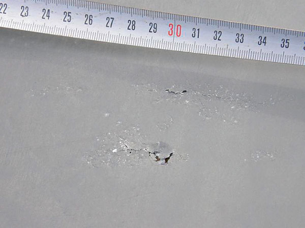 Objekt bazénu je riešený ako trojtrakt. V strednom trakte sa nachádza vyhrievaný bazén, v bočných traktoch technické zázemie a špeciálne zariadenia súvisiace s prevádzkou bazéna. Pôvodnú strechu bazéna navrhol projektant ako jednoplášťovú segmentovú konštrukciu v tvare oblúka. Obvodovú stenu v miestnosti s vírivkou tvorí murovaná konštrukcia s keramickým obkladom. Stropná konštrukcia je zo sadrokartónu. S prevádzkou bazéna sa začalo v roku 2002. V roku 2010 začala zatekať strecha. V zime na prelome rokov 2009 a 2010 napadalo na strechu väčšie množstvo snehu, v dôsledku čoho sa odtrhla časť podhľadu, vyhotoveného z heraklitovej dosky. Objednávateľ vyzval dodávateľa na prieskum strechy, na základe ktorého sa dodávateľ rozhodol podhľad opätovne ukotviť, a to zápustkami z nehrdzavejúcej ocele s veľkoplošnými podložkami. V priebehu stavebných prác sa však ukázalo, že pôvodné kotviace prvky boli výrazne skorodované. Ďalší problém predstavovali viaceré trhliny v plechovej krytine (obr. 3), odhalené počas údržby strechy, vykonanej po zime v roku 2010. Tieto trhliny sa odstránili preplátovaním a zacínovaním.