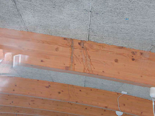 Existujúca skladba strešného plášťa nespĺňa tepelnotechnické vlastnosti požadované normou. Montáž plechovej krytiny na báze titánzinku sa realizovala v rozpore s odporúčaniami výrobcu plechovej krytiny, v dôsledku čoho vzniká na jej povrchu korózia (obr. 2). Plechovú krytinu preto bolo nutné na viacerých miestach opravovať. Ako spojovací materiál dreveného záklopu sa použili oceľové klince, ktoré v dôsledku pôsobenia vlhkosti skorodovali. Tepelná izolácia nemá dostatočnú hrúbku a je uložená nespojito. Jednotlivé pásy parozábrany z PE fólie umiestnené na latách medzi lepenými väzníkmi mali dostatočne kvalitne vyhotovené spoje, niektoré však boli rozlepené. Napojenie na bočnú stranu väzníka nebolo dostatočne tesné (obr. 8) a na drevených väzníkoch sa zistili početné stopy po stekajúcej vode (obr. 4). Po odokrytí strešného plášťa sa zistila prítomnosť vlhkosti a napadnutie záklopu drevokaznými hubami a plesňami. Pripojenie strešnej krytiny na prestupujúcu oceľovú konštrukciu nadväzujúcej zasklenej časti strechy hliníkovou fóliou nie je tesné. Rozličná dĺžková rozťažnosť napájaných konštrukcií spôsobila v mieste napojenia oceľovej konštrukcie na strešnú konštrukciu deštrukciu hliníkovej fólie a následné zatekanie zrážkovej vody do strechy.