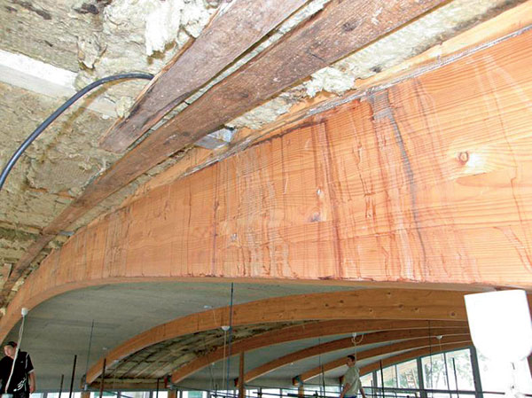 - na zhotovenie podhľadu sa použili pôvodné heraklitové dosky, ktoré sa kotvili demontovanými kotviacimi prvkami vrátane veľkoplošných podložiek. Heraklitové dosky sa osadili vo vzdialenosti 30 mm od bočných stien lepených oblúkových väzníkov.