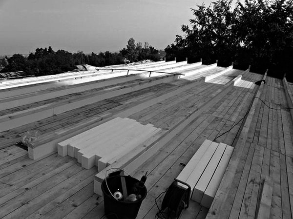- uloženie poistnej hydroizolácie. Ako poistná hydroizolácia sa použila fólia Jutadach 115 A. P. ukladaná na presah. Spoje sa prelepili páskou Jutadach SP 38. Kontralaty následne ukladané nad poistnú fóliu sa podkladali tesniacou páskou. Na utesnenie vrcholu strechy sa použila fólia Alkorplan 1,5;