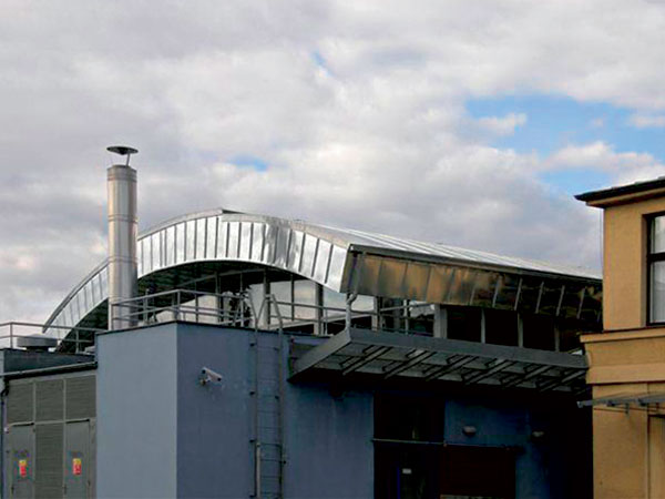 - uloženie novej strešnej krytiny na báze titánzinku s hrúbkou plechu 0,7 mm. Zároveň sa osadili vetracie mriežky a ventilačné turbíny, ktoré umožňujú účinné odvetranie strešného plášťa a zabezpečujú dostatočnú ochranu proti vetru, náporovému dažďu alebo snehu (obr. 10).